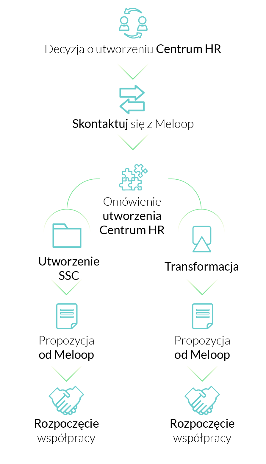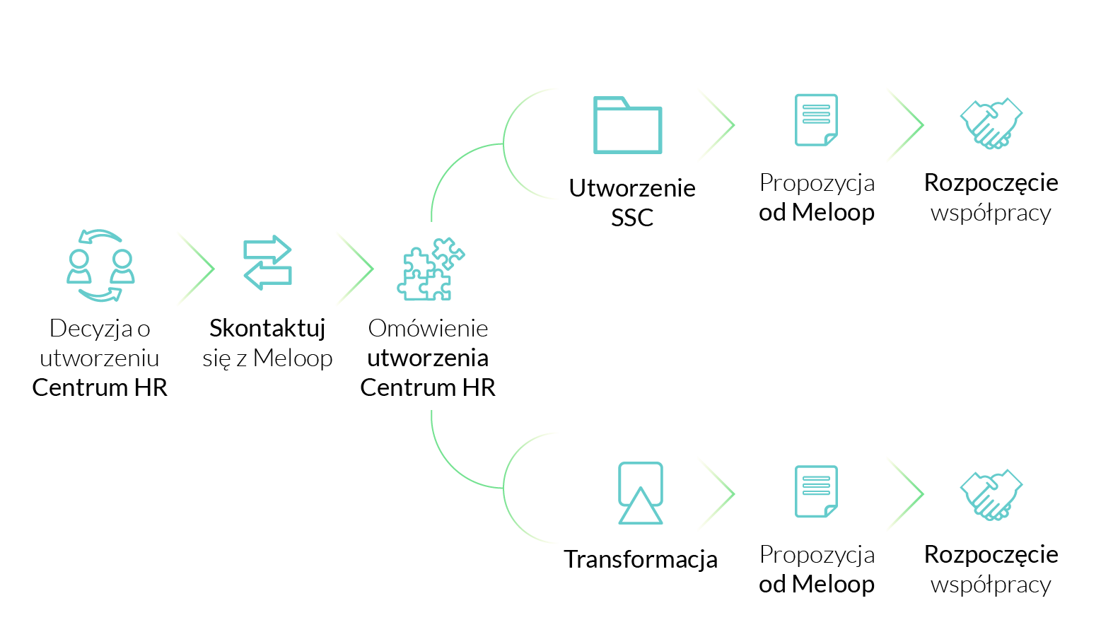 Meloop towarzyszy Ci w procesie tworzenia Centrum HR / SSC – od założenia podmiotu prawnego, przez budowę efektywnej struktury organizacyjnej, rekrutację kluczowych pracowników, projektowanie procesów i wdrożenie umów SLA oraz wskaźników KPI, po skuteczny transfer wiedzy i procedur. Wspieramy również zarządzanie zmianą przez cały okres transformacji.